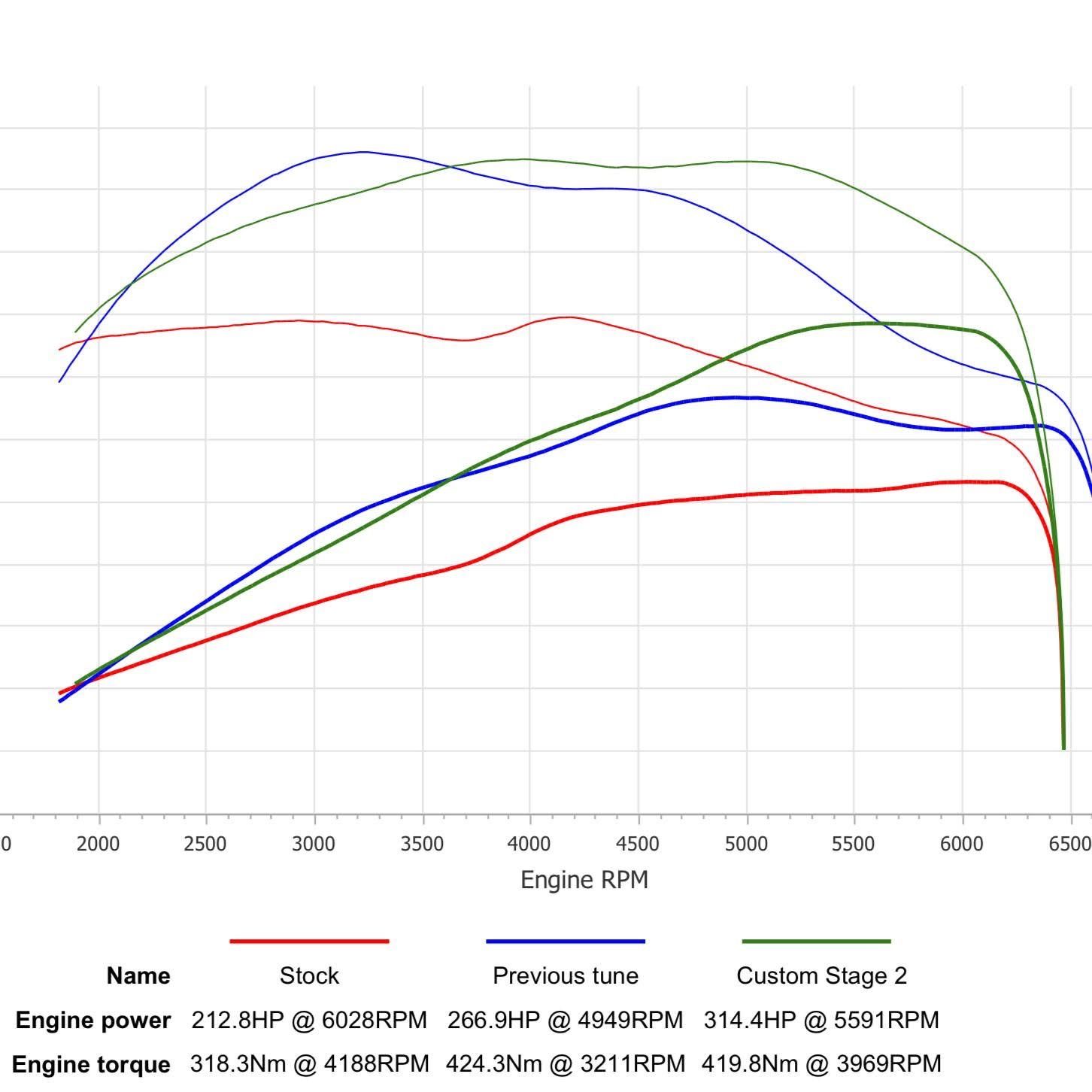 As usual, the dyno plot shows all.. We lose a bit of torque and response low down in the RPM range however, once up past 3500RPM the gains just keep on coming - on the example given, singing out to 382HP @ 6500RPM!